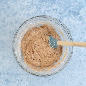 - Pour the wet ingredients into the dry ingredients, mix with a wooden spoon to just combine